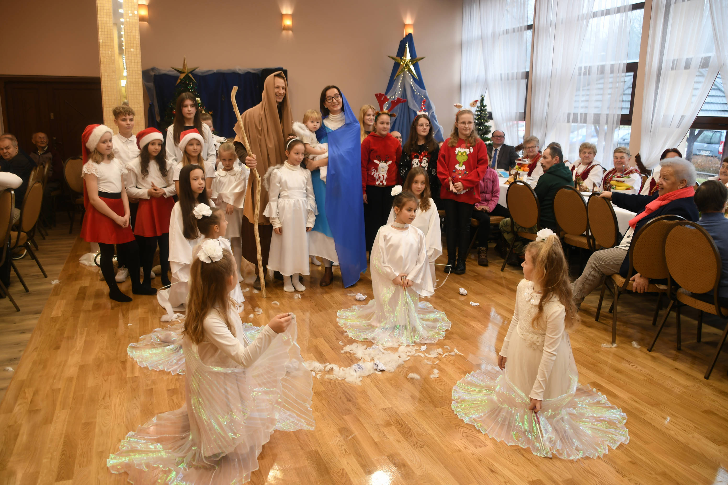 Po przywitaniu zgromadzonych gości oraz złożeniu świątecznych życzeń przez Kierownika GOPS, Wójta Gminy, przewodniczącą Rady Gminy Lipnica Murowana oraz księdza proboszcza odczytany został tekst z Pisma Świętego nawiązujący do narodzenia Jezusa Chrystusa. Następnie ks. proboszcz Mariusz Jachymczak dokonał poświęcenia opłatków, po czym uczestnicy spotkania przełamali się opłatkiem składając sobie nawzajem najserdeczniejsze życzenia, by w końcu zasiąść do wigilijnego stołu. Oprawę artystyczną uroczystości przygotowały po raz kolejny dzieci z Eucharystycznego Ruchu Młodych wraz z rodziną Państwa Potoniec, tworzącymi Świętą Rodzinę. Nad oprawą artystyczną czuwała siostra Magdalena Sitkowska. Spotkaniu towarzyszyła ciepła atmosfera, pełna radości, wzajemnego szacunku i wdzięczności. Kolędy w wykonaniu zespołu „Raj” z Rajbrotu nadawały spotkaniu szczególny charakter. Dla uczestników spotkania przygotowane zostały również świąteczne paczki.